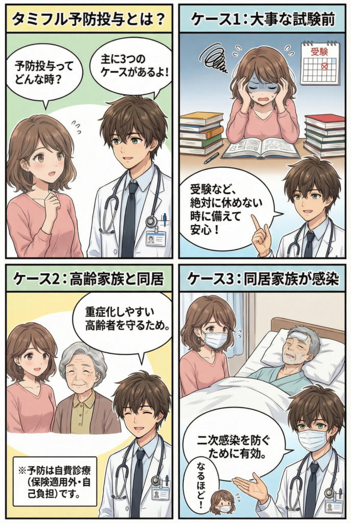 タミフルの予防投与は、次のような場面で活用されることが多くあります。