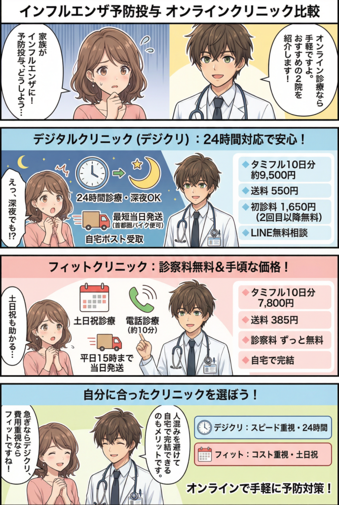 インフルエンザの予防投与は、オンライン診療に対応したクリニックで手軽に受けることができます。中でも フィットクリニック と デジタルクリニック(デジクリ) は実績があり、利用しやすいクリニックです。それぞれの特徴を分かりやすくまとめました。